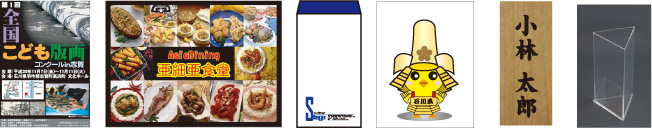 印刷以外にもキャラクターやロゴなどのデザイン制作またはデータ制作、木材・鉄類・アクリル・布・シールなどのオリジナル製品の制作を行っております。例としてオリジナルTシャツやのぼり、表札やアクリル加工品、蓄光製品など多岐に渡り制作をしております。