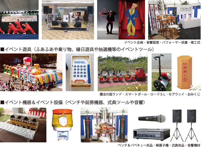 レンタル部門ではイベントにちなんだ遊具、厨房機器、照明、音響など数多く保有しております。