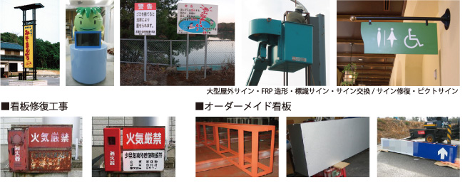 屋内外を問わず、大型看板から小さな看板、標識や案内看板はもちろん、短期の誘導看板なども取り扱います。また、古くなった看板の修復工事なども行っております。